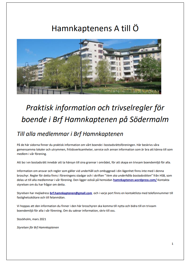 I broschyren Hamnkaptenens A till Ö finns praktisk information och trivselregler för boende i Brf Hamnkaptenen.