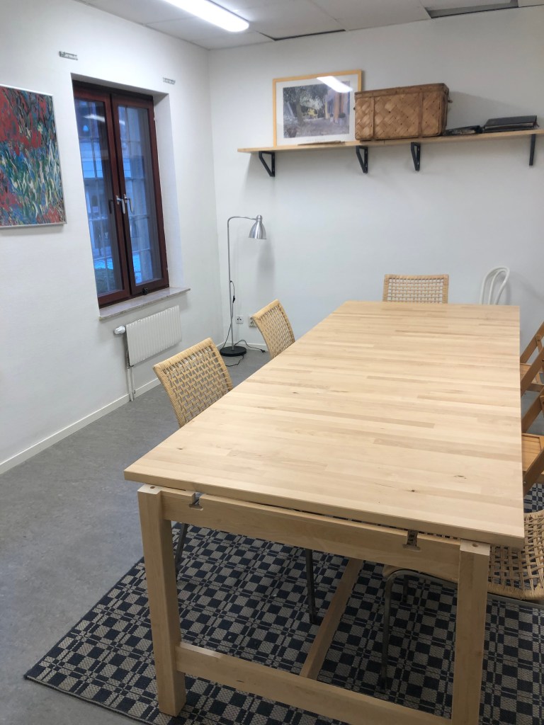 I anslutning till fritidslokalen hittar du pysselrummet som även kan användas till möten. Du kommer in i rummet med din elektroniska nyckelbricka och rummet kan bokas via vårt digitala bokningssystem timvis mellan kl 07-22.