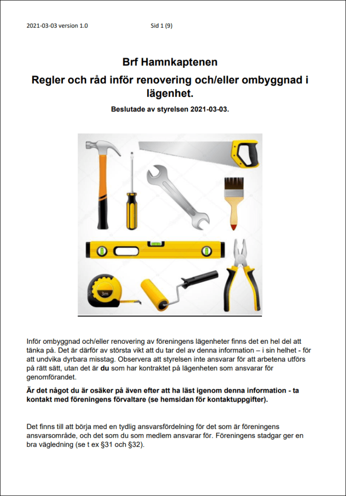 I pdf:en Regler och råd inför renovering och/eller ombyggnad i lägenhet kan du läsa om Brf Hamnkaptenens råd och regler för dig som tänker bygga om.